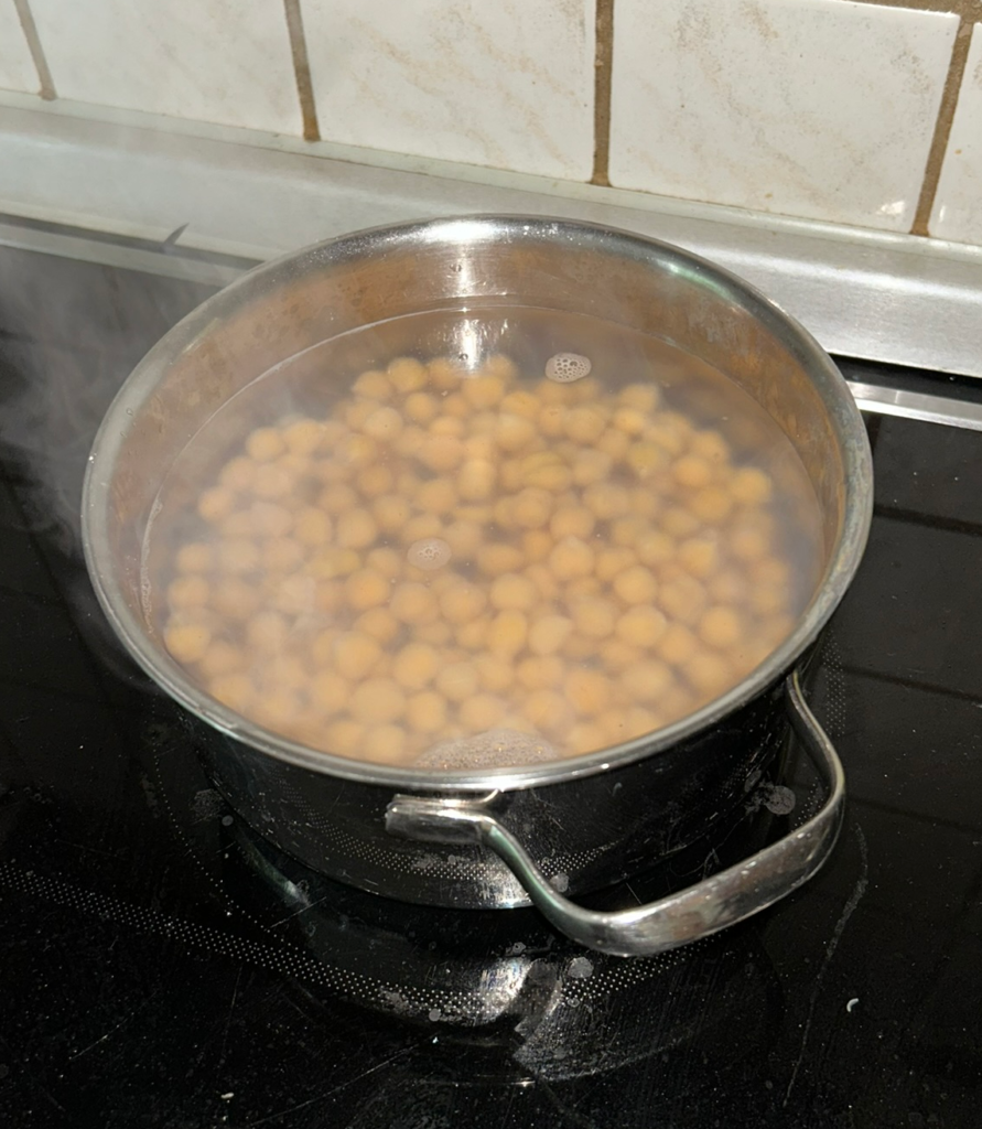 1. If you are using dried chickpeas, soak them overnight and drain. Boil them in a pot of water with a tablespoon of baking powder until they are soft and can easily be smashed with your fingers (at least 1h 15min). If you are using canned chickpeas, drain them and cook them in the same way for 15 minutes.