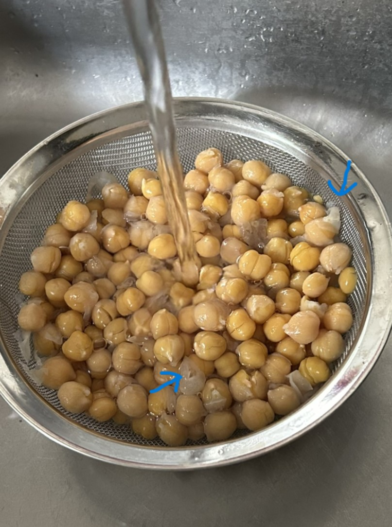 After the cooking process, drain and rinse them thoroughly under cold water before continuing. You will see that the chickpeas will lose some of their skin (see picture below) and if you want the smoothest results, remove it from the ones who have their skin still attached.