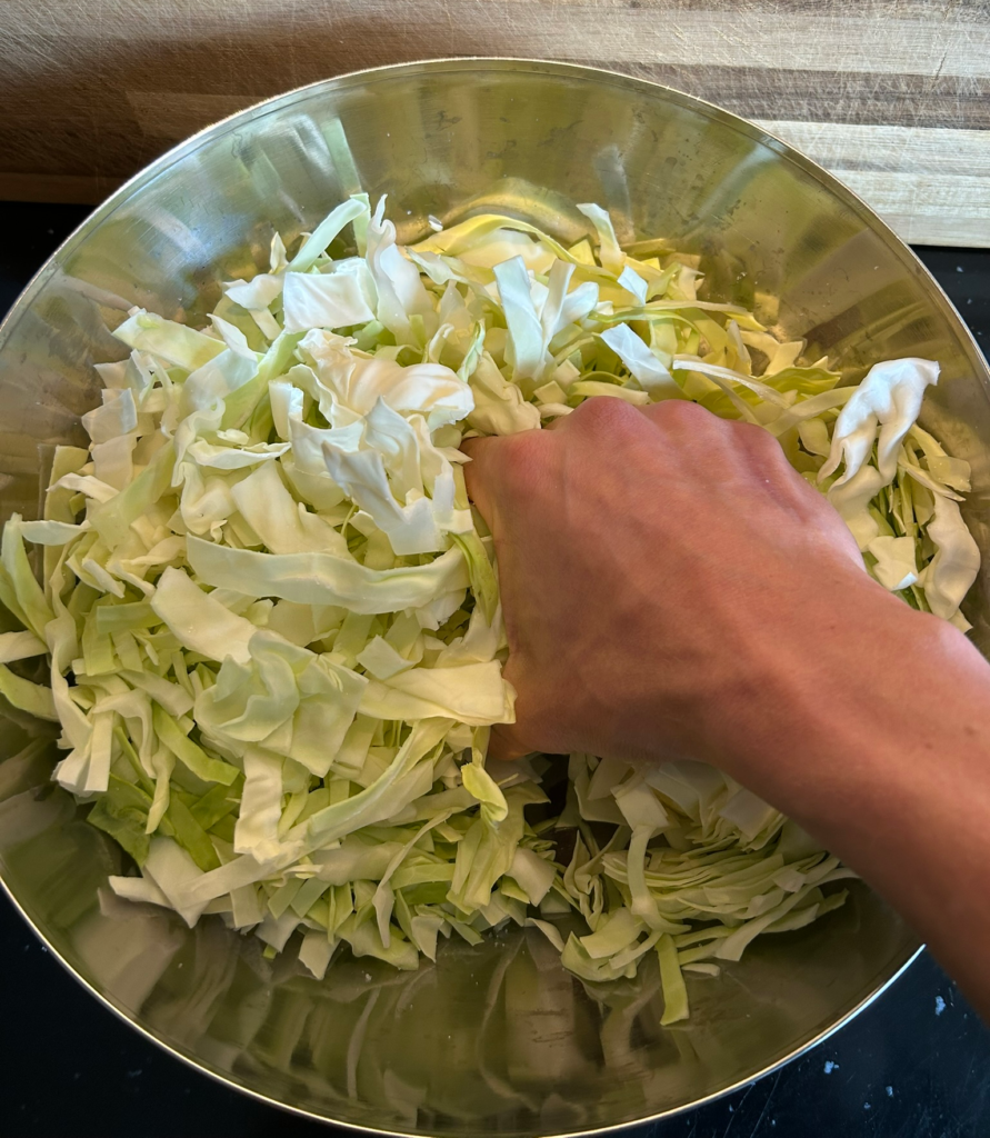 To season and to drive out any excess water, I like to heavily salt it, and massage the cabbage with my hands for a few minutes.