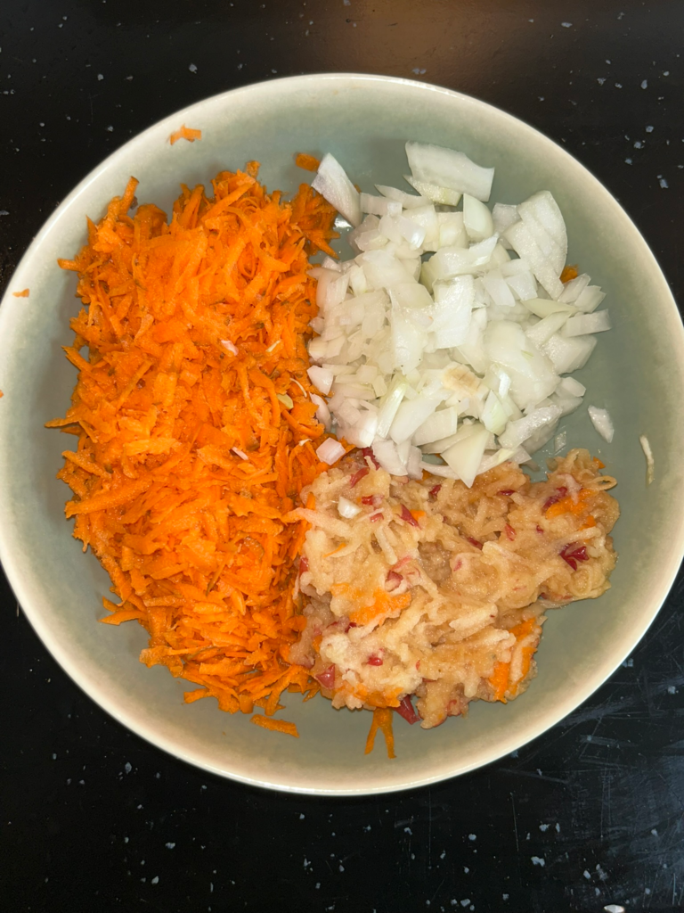 - Into a separate bowl, grate the apple and carrots (optionally, peel carrots beforehand). Dice the onion and it to the same bowl.