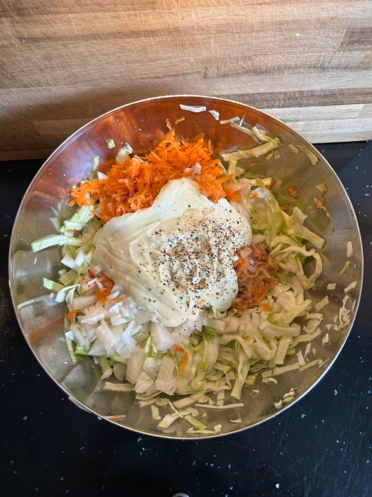 Drain out the sweated-out cabbage-water and throw the other vegetables and dressing into the bowl.