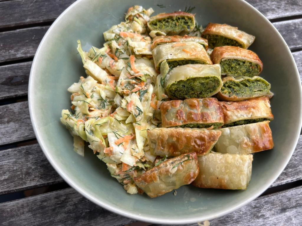 - Try to remove most of the sweat from the cabbage bowl and add the remaining vegetables, the dressing, as well as the fresh dill. Mix well to combine