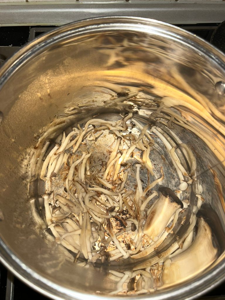 1. In a large pot, fry the mushrooms on high heat until most of their water content evaporates, and they develop a slight dark colour. Make sure not to overfill the pot with the mushrooms to prevent them from cooking. If necessary, fry in multiple batches to ensure each piece has contact with the bottom of the pot.