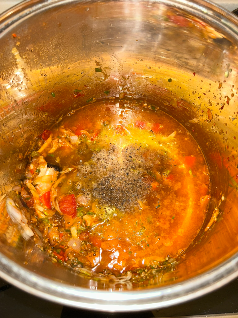 3. Adjust the seasoning with salt and black pepper. Before serving, remove the scotch bonnet and bay leaf.
