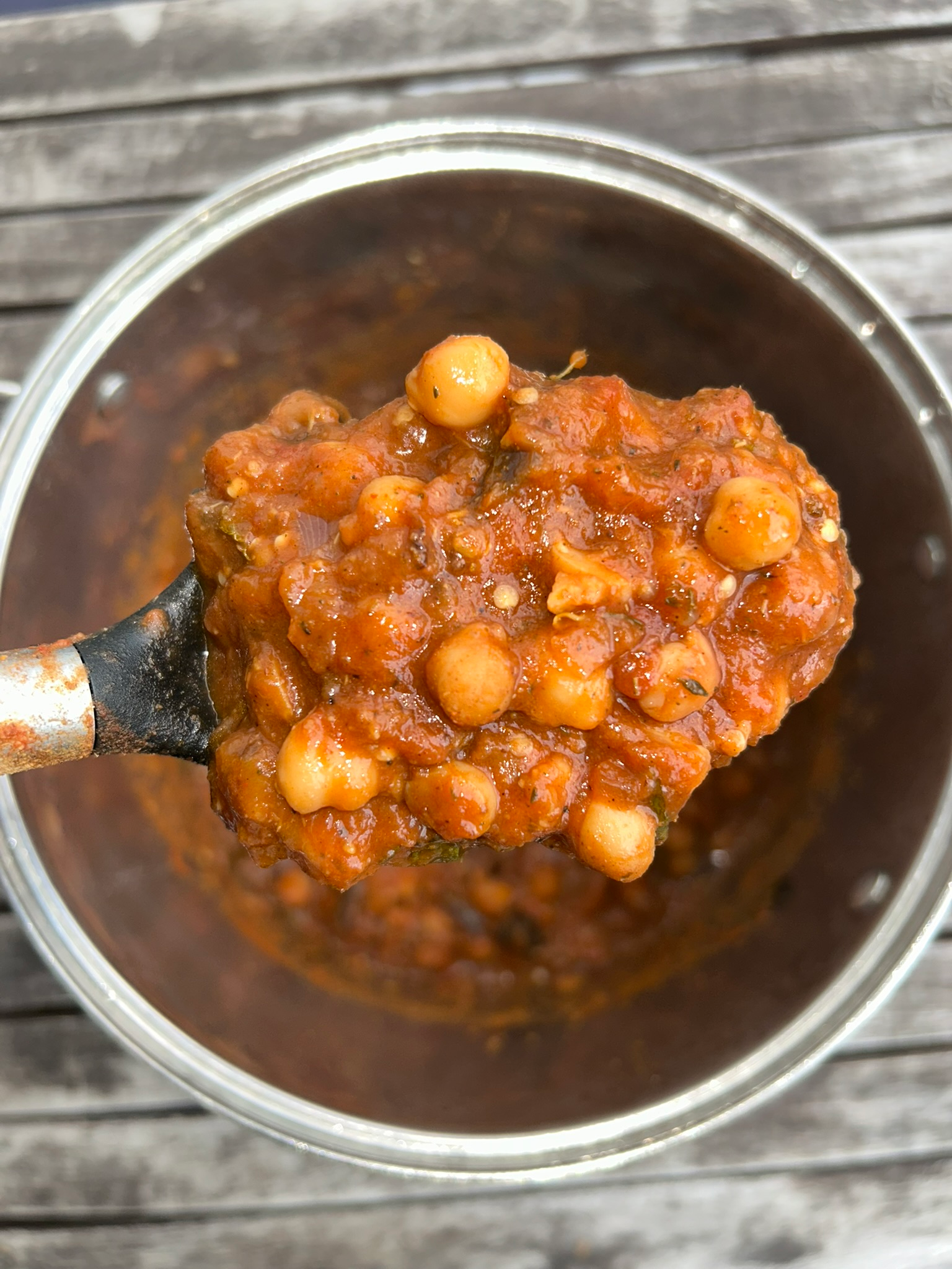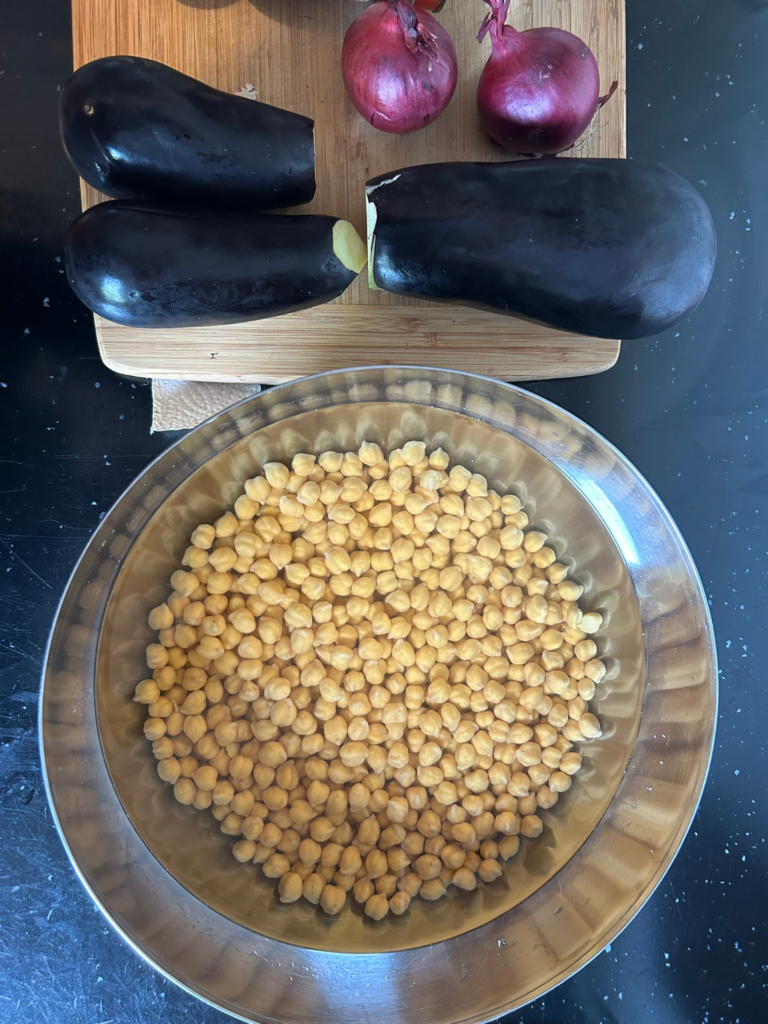 - When both are done, add chickpeas and eggplants to the pot with the vegetable stock. Bring to a boil and let it simmer on low heat for at least 10 minutes.