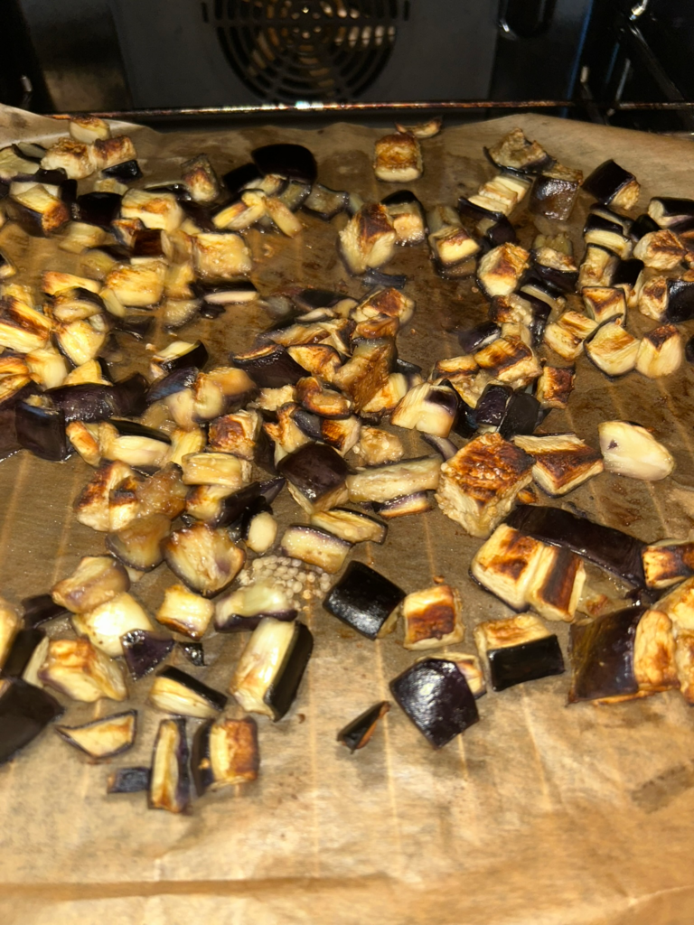 - Preheat the oven to 200°C. Trim the ends of the eggplants and dice the rest into mouth-sized pieces. Place them in a bowl, add salt and let them rest for 20 minutes to draw out moisture. Remove (drain) the liquid and coat the eggplants with 2 tablespoons of olive oil. Align an oven tray with parchement paper, spread out the eggplants and bake them in the oven until brown (about 30 minutes).