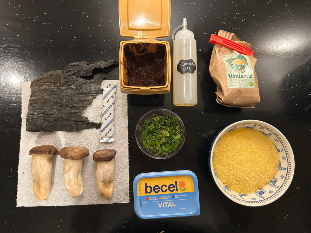 - Add polenta to a plate, place the mushrooms on top and sprinkle fresh parsley. Finally, squeeze some lemon juice and pour any remaining "miso sauce" from the pan onto the plate.