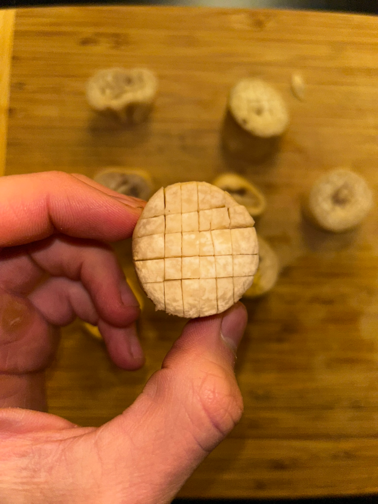In the first step, cut your mushrooms stems to have a scallop-like shape and scorch one side vertically and horizontally. Reserve the mushroom heads for another dish.