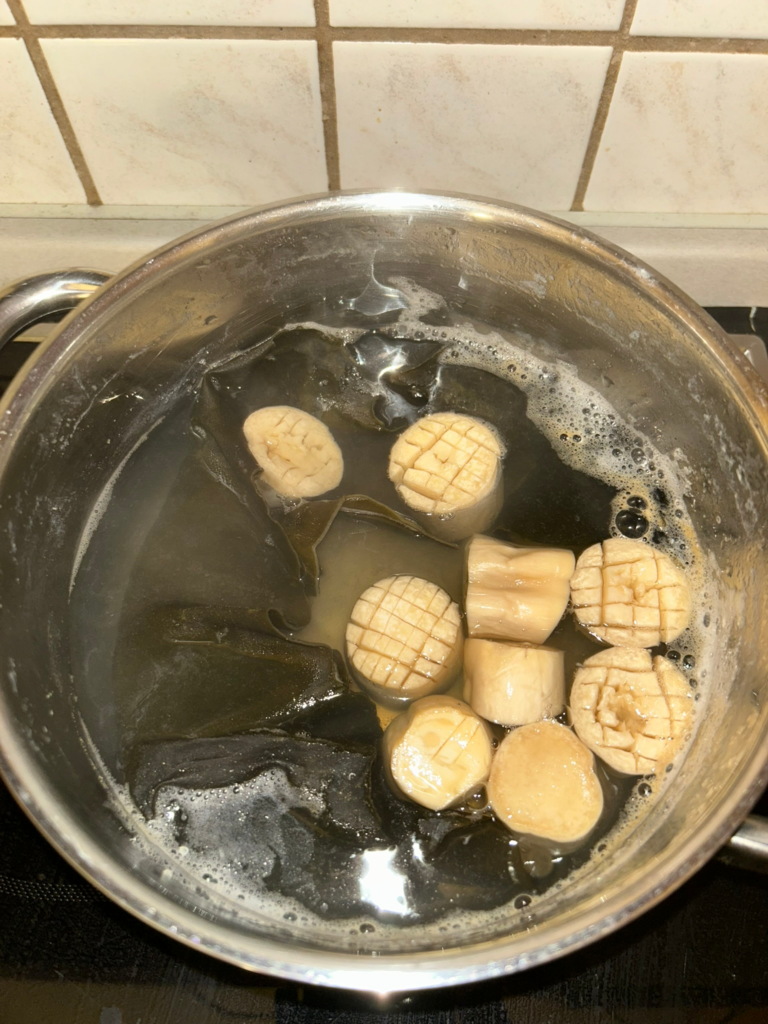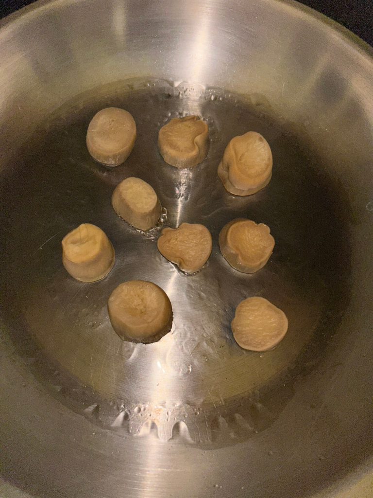 The next step will be controversial. Set-up a broth using the seaweed and vegan dashi powder and boil the mushroom scallops. I know that most people will tell you that this is a sin, but there are actually good reasons for doing that (Osmosis, I believe):