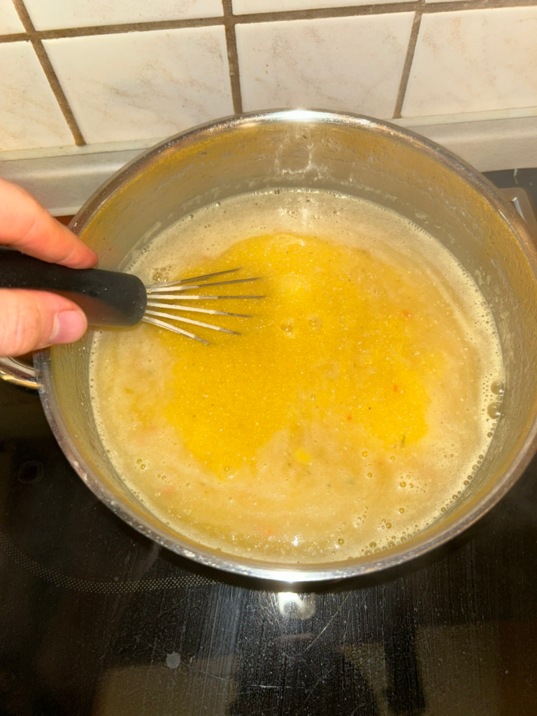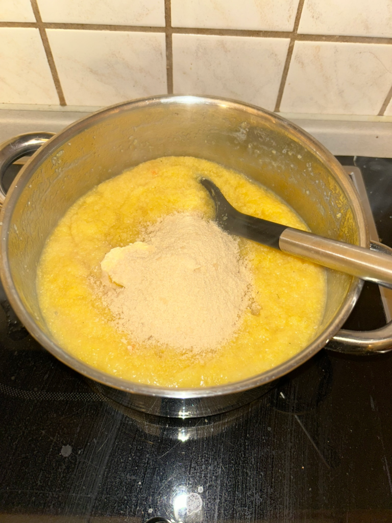 - Add vegan butter, nutritional yeast and cooking cream to polenta, stir and let it rest until serving.