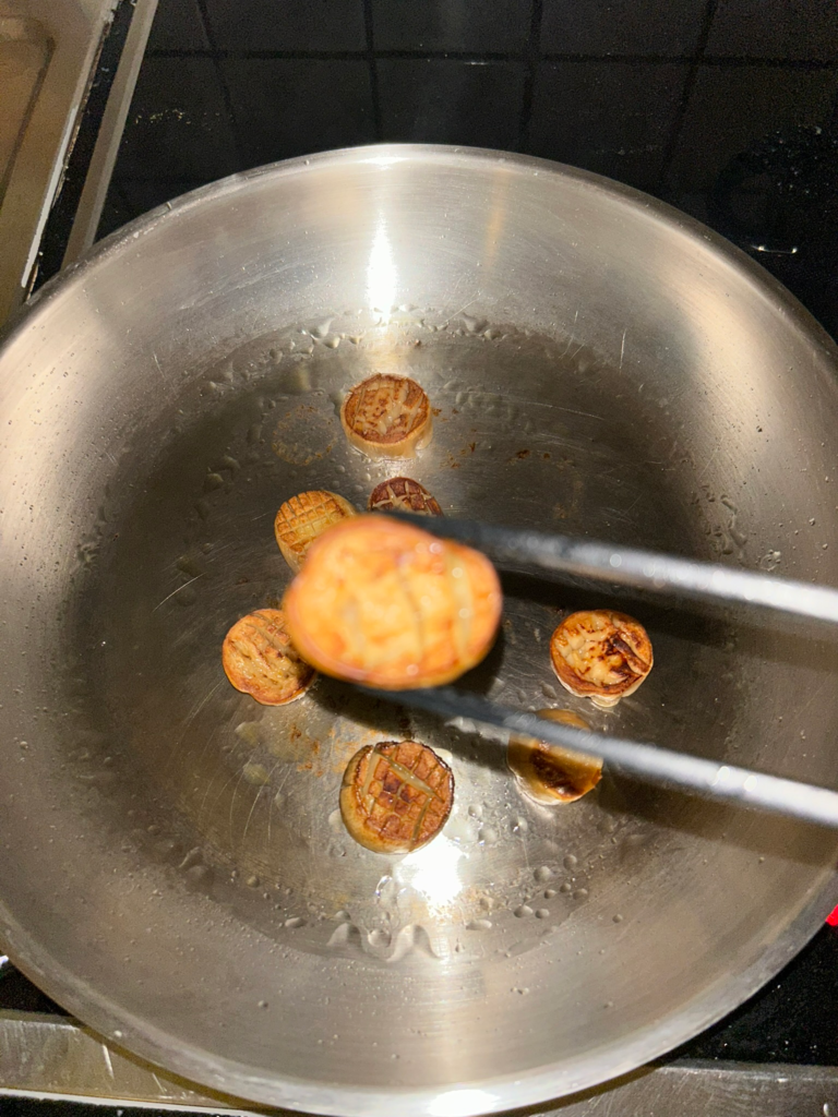 - Sear them in a pan, with some cooking oil, until the scorn side is slightly caramelized. You can press them down with another pan to speed up the process.
