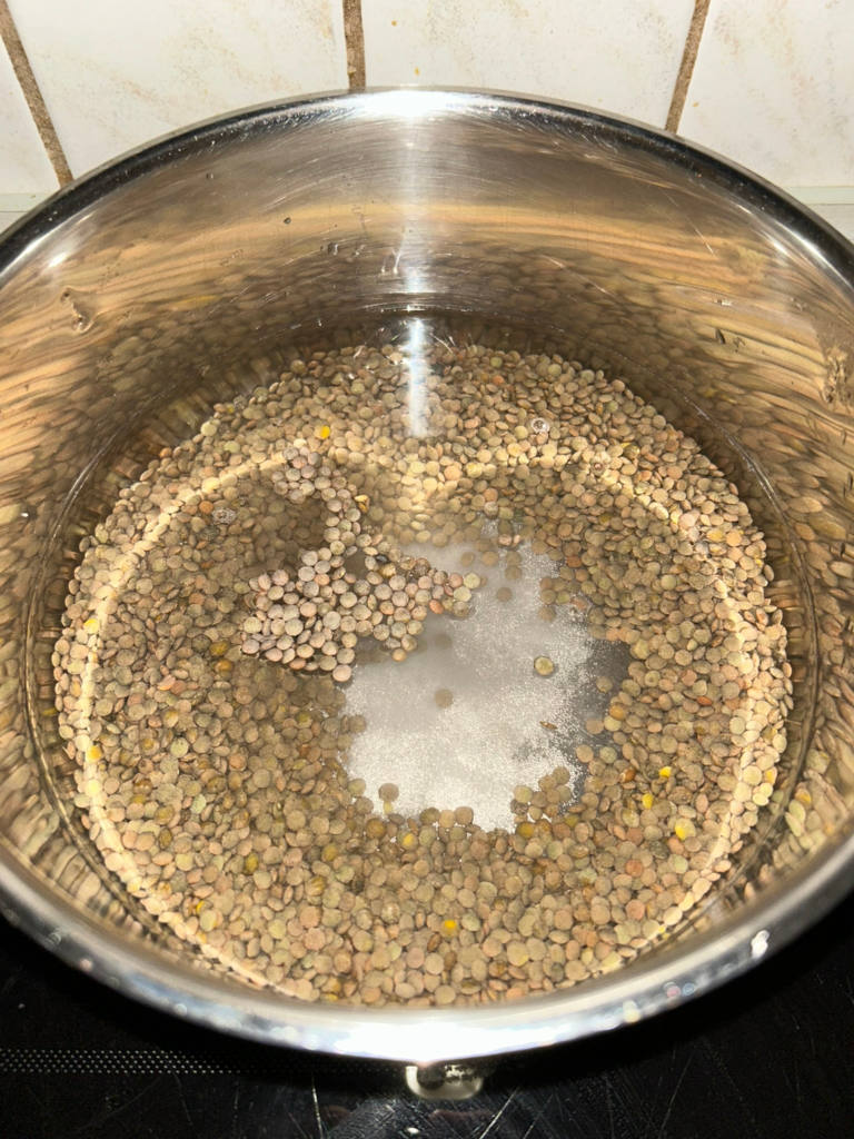 - In a big pot, bring 500ml of the water to a bowl, add a generous amount of salt and cook the lentils for 15 minutes.