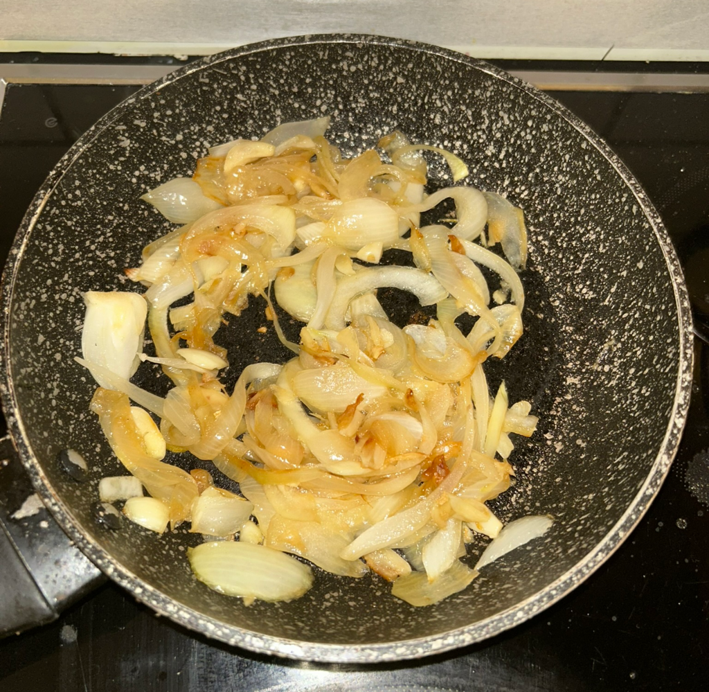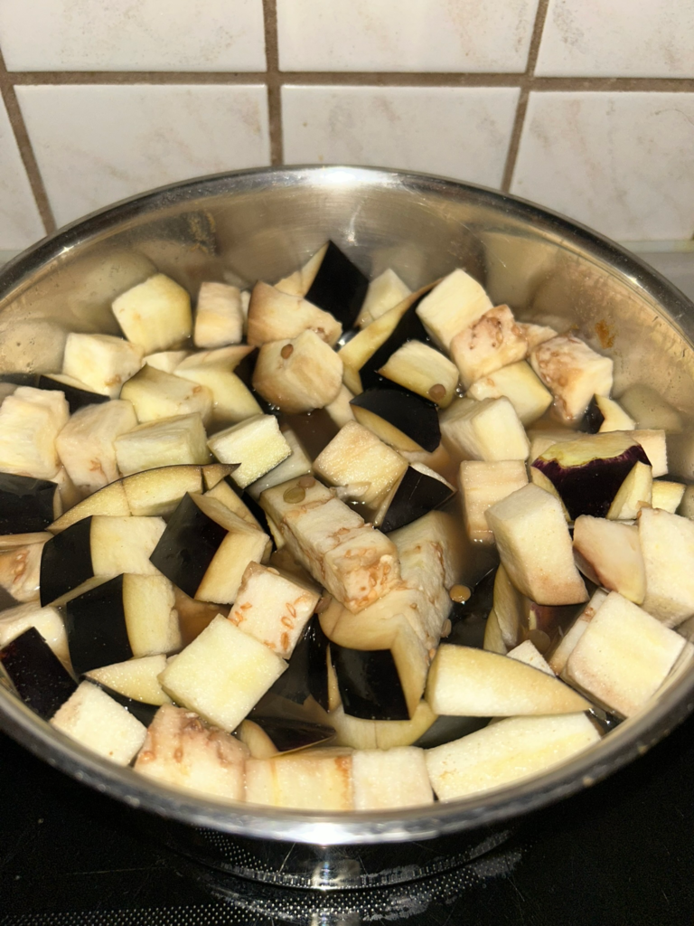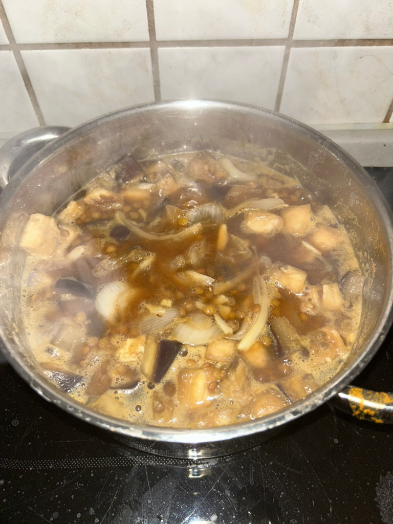 - In the meantime, cut the eggplants into bite-size cubes. When the 15 minute have passed, add the eggplants and cumin to the pot and cook for an additional 10 minutes. Add the pomegranate juice and keep the mixture simmering on low-heat. At the same time, heat up some olive oil in a pan and sauté the onion, garlic and chilli on medium heat until they caramelize (15 minutes), before adding them to the pot.