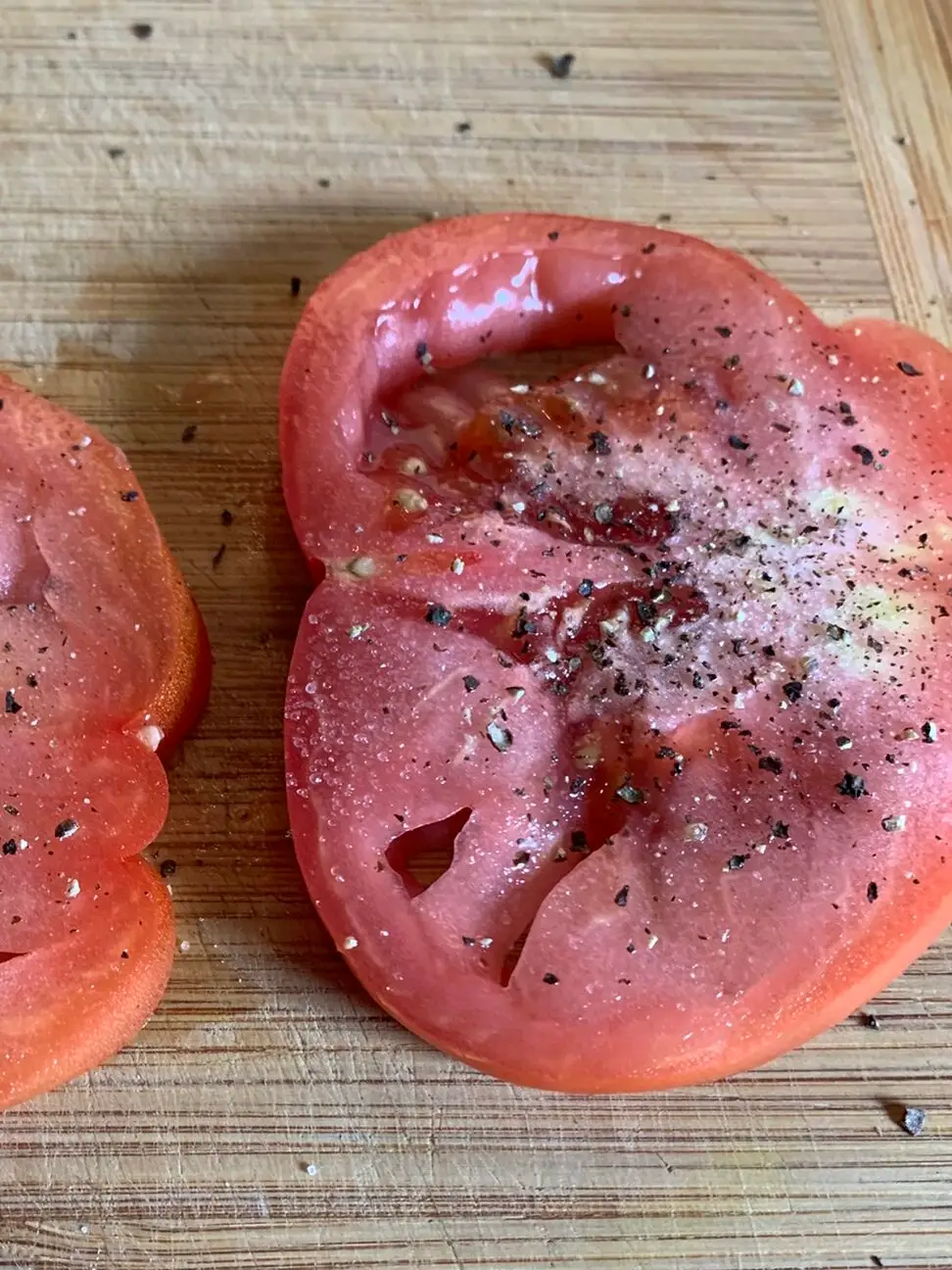 2. Sprinkle over salt and fresh black pepper on each side of the tomato slices.