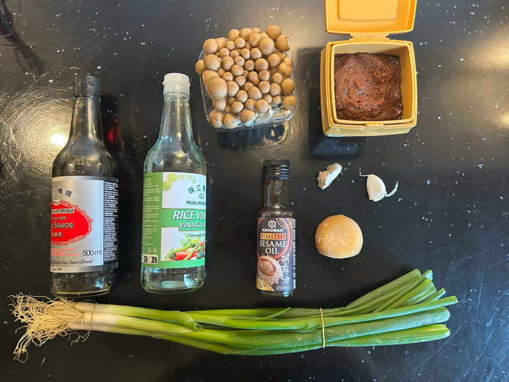 - Top with mushrooms, scallion and sesame oil.