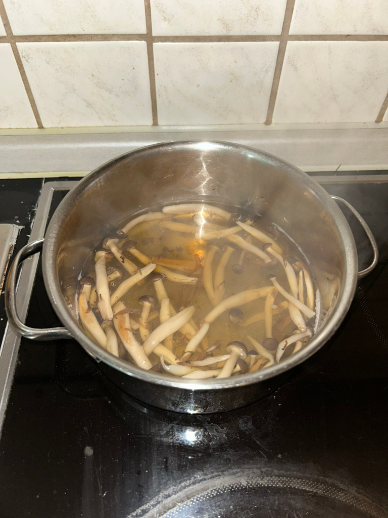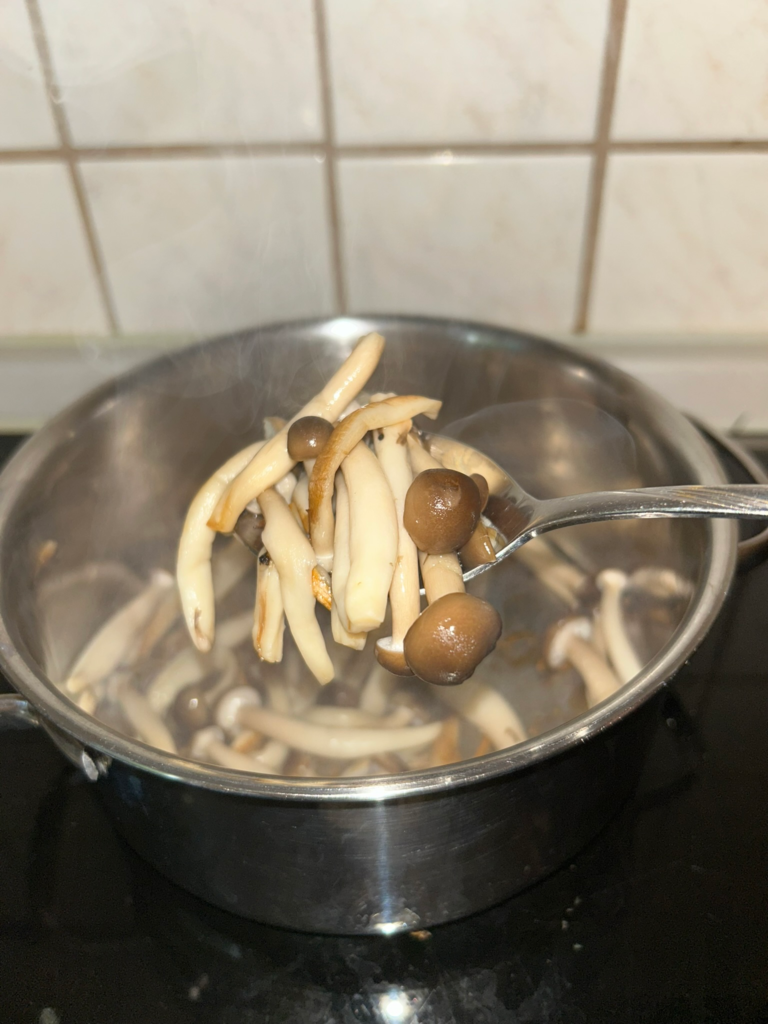 - In a pot, sauté the mushrooms for 5 minutes on medium-high heat. After, reserve one tablespoon for topping and fill the pot with the water. Bring to a boil and let it simmer for 10 minutes on medium heat.
