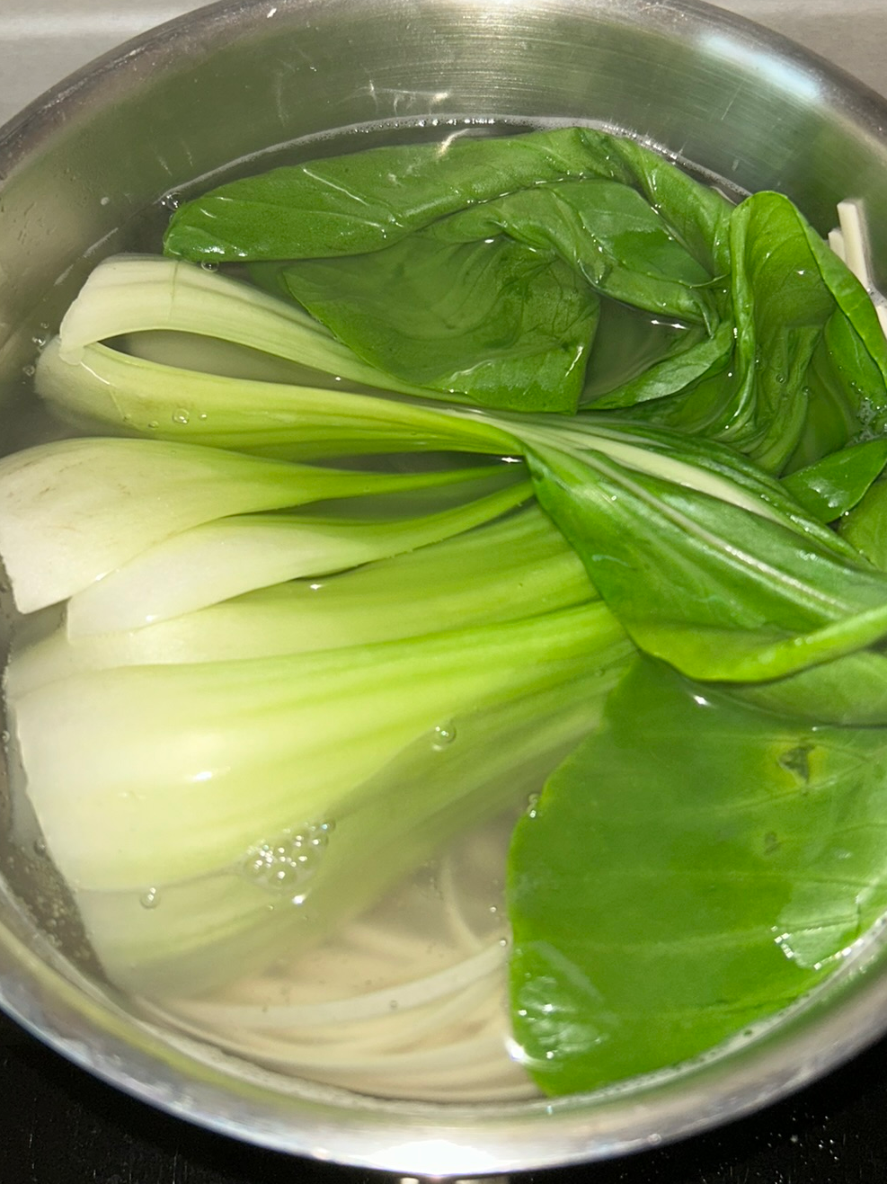 - Bring a pot of water to a boil, cook your noodles according to package instruction and blanch the pak choi for 1-2 minutes in the same pot.